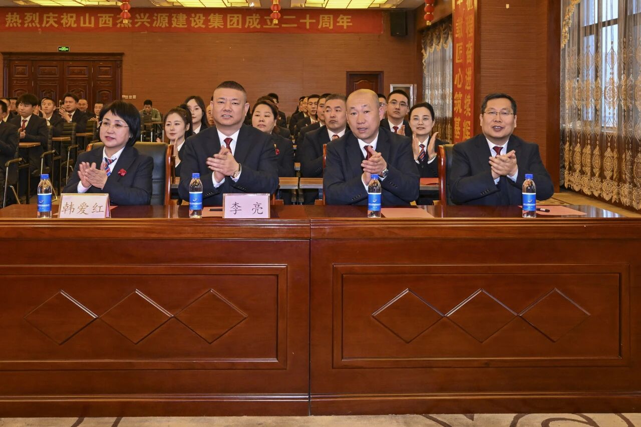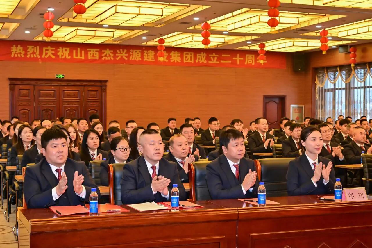 会场后方高悬主横幅:热烈庆祝山西杰兴源建设集团成立二十周年!